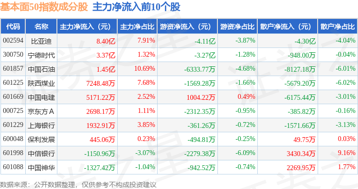 资金流向方面,基本面50(000925)指数成份股当日主力资金净流出合计67.51亿元,游资资金净流入合计21.02亿元,散户资金净流入合计46.49亿元。成份股资金流向详情见下表: