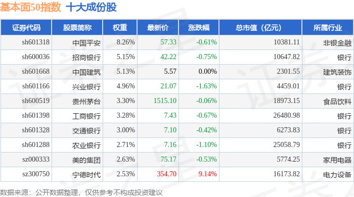 证券之星消息,9月15日,基本面50(000925)指数报收于4670.75点,跌0.18%,成交1194.58亿元,换手率0.37%。当日该指数成份股中,上涨的有10家,宁德时代以9.14%的涨幅领涨,下跌的有35家,工业富联以3.23%的跌幅领跌。