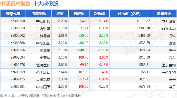 证券之星消息,9月15日,中证新兴(000964)指数报收于10753.77点,涨0.72%,成交3857.87亿元,换手率1.61%。当日该指数成份股中,上涨的有47家,宁德时代以9.14%的涨幅领涨,下跌的有53家,华勤技术以5.0%的跌幅领跌。