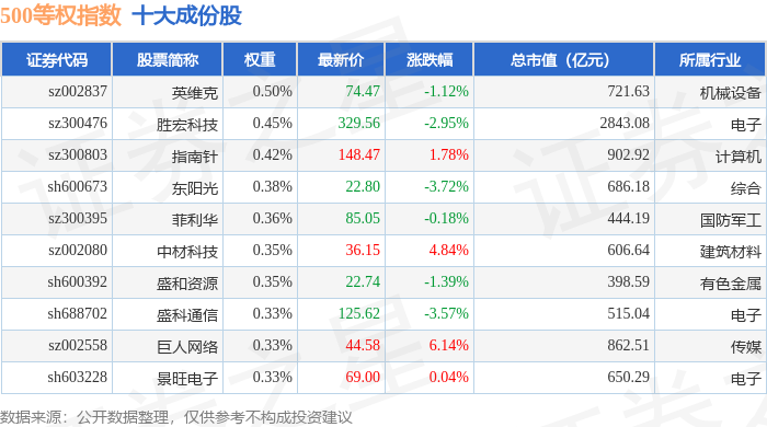 证券之星消息,9月15日,500等权(000982)指数报收于8665.79点,跌0.19%,成交4418.29亿元,换手率2.11%。当日该指数成份股中,上涨的有156家,纳芯微以10.79%的涨幅领涨,下跌的有331家,东华软件以6.11%的跌幅领跌。