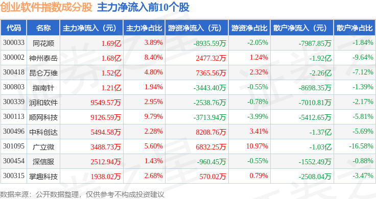 资金流向方面,创业软件(399264)指数成份股当日主力资金净流出合计10.69亿元,游资资金净流入合计7.12亿元,散户资金净流入合计3.57亿元。成份股资金流向详情见下表:
