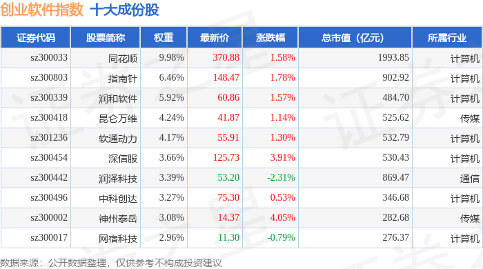 证券之星消息,9月15日,创业软件(399264)指数报收于1612.69点,涨0.08%,成交526.64亿元,换手率4.31%。当日该指数成份股中,上涨的有17家,神州泰岳以4.05%的涨幅领涨,下跌的有33家,易华录以4.24%的跌幅领跌。