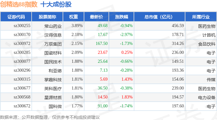 创精选88(399291)指数十大成份股详情如下: