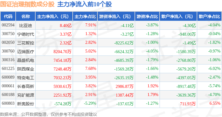 资金流向方面,国证治理(399322)指数成份股当日主力资金净流出合计45.54亿元,游资资金净流入合计7.3亿元,散户资金净流入合计38.24亿元。成份股资金流向详情见下表:
