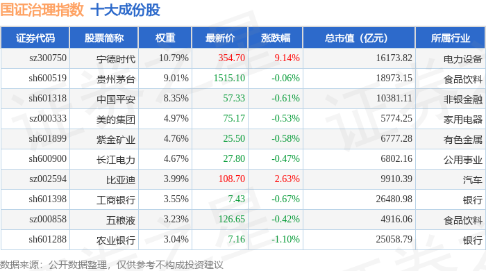 证券之星消息,9月15日,国证治理(399322)指数报收于9981.14点,涨0.91%,成交1573.2亿元,换手率0.43%。当日该指数成份股中,上涨的有17家,宁德时代以9.14%的涨幅领涨,下跌的有33家,工业富联以3.23%的跌幅领跌。