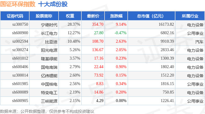 证券之星消息,9月15日,国证环保(399358)指数报收于5199.84点,涨3.32%,成交1139.69亿元,换手率1.17%。当日该指数成份股中,上涨的有25家,天赐材料以9.99%的涨幅领涨,下跌的有11家,晶科能源以3.34%的跌幅领跌。