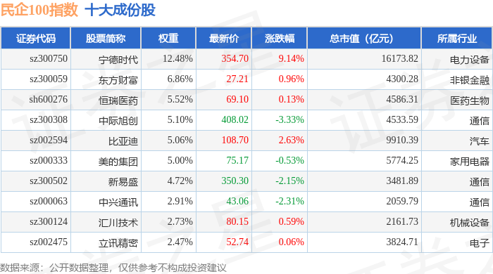 民企100(399362)指数十大成份股详情如下: