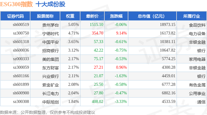 资金流向方面,ESG300(399378)指数成份股当日主力资金净流出合计122.95亿元,游资资金净流入合计48.34亿元,散户资金净流入合计74.62亿元。成份股资金流向详情见下表: