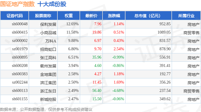 国证地产(399393)指数十大成份股详情如下: