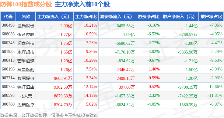 资金流向方面,防御100(399403)指数成份股当日主力资金净流出合计57.52亿元,游资资金净流入合计26.74亿元,散户资金净流入合计30.78亿元。成份股资金流向详情见下表: