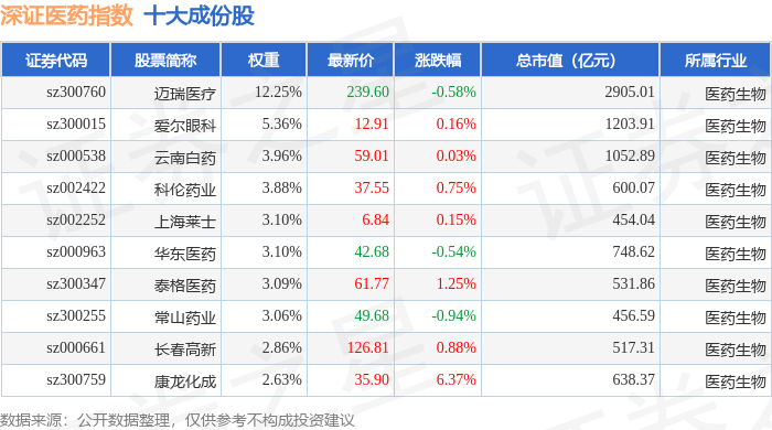 证券之星消息,9月15日,深证医药(399618)指数报收于9065.18点,跌0.08%,成交290.15亿元,换手率1.54%。当日该指数成份股中,上涨的有15家,康龙化成以6.37%的涨幅领涨,下跌的有41家,华大基因以3.11%的跌幅领跌。