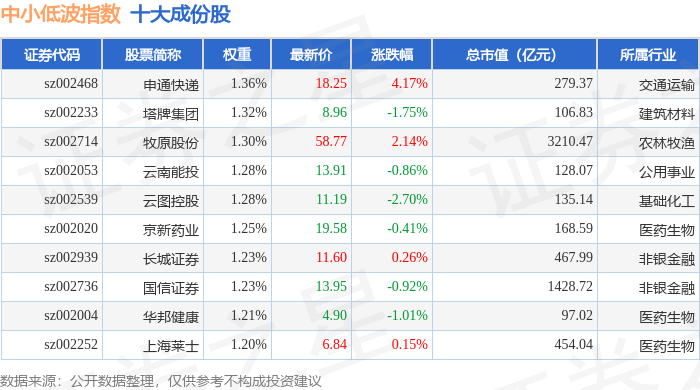 证券之星消息,9月15日,中小低波(399663)指数报收于1956.55点,跌0.12%,成交505.17亿元,换手率1.28%。当日该指数成份股中,上涨的有33家,天康生物以8.2%的涨幅领涨,下跌的有65家,东方铁塔以3.16%的跌幅领跌。