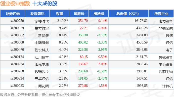 创业板50(399673)指数十大成份股详情如下: