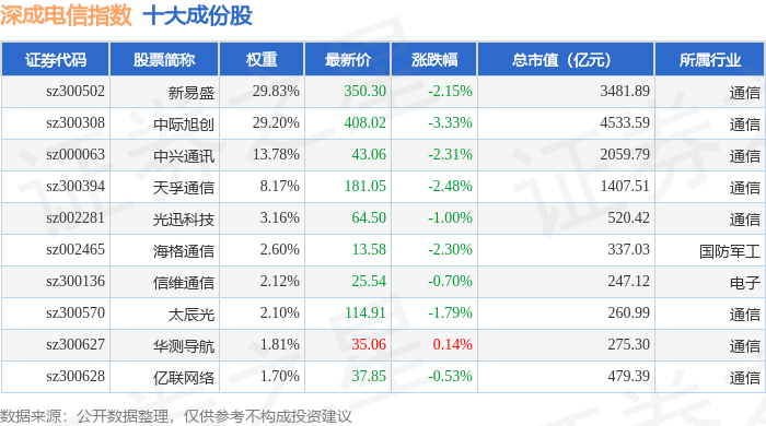 证券之星消息,9月15日,深成电信(399688)指数报收于5356.69点,跌2.38%,成交485.67亿元,换手率3.43%。当日该指数成份股中,上涨的有3家,锐捷网络以1.14%的涨幅领涨,下跌的有12家,中际旭创以3.33%的跌幅领跌。