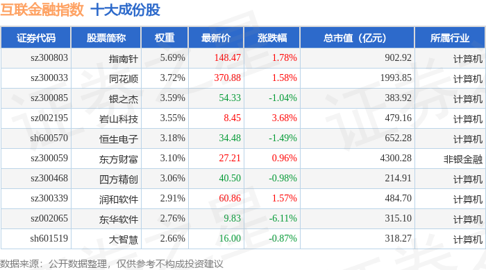 资金流向方面,互联金融(399805)指数成份股当日主力资金净流出合计23.46亿元,游资资金净流入合计3.72亿元,散户资金净流入合计19.75亿元。成份股资金流向详情见下表: