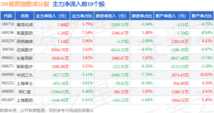 资金流向方面,300医药(399913)指数成份股当日主力资金净流出合计2.34亿元,游资资金净流入合计3532.15万元,散户资金净流入合计1.99亿元。成份股资金流向详情见下表: