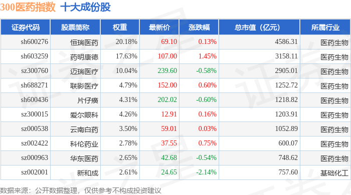 300医药(399913)指数十大成份股详情如下: