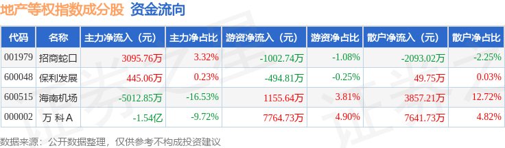 资金流向方面,地产等权(399983)指数成份股当日主力资金净流出合计1.69亿元,游资资金净流入合计7422.82万元,散户资金净流入合计9455.68万元。成份股资金流向详情见下表: