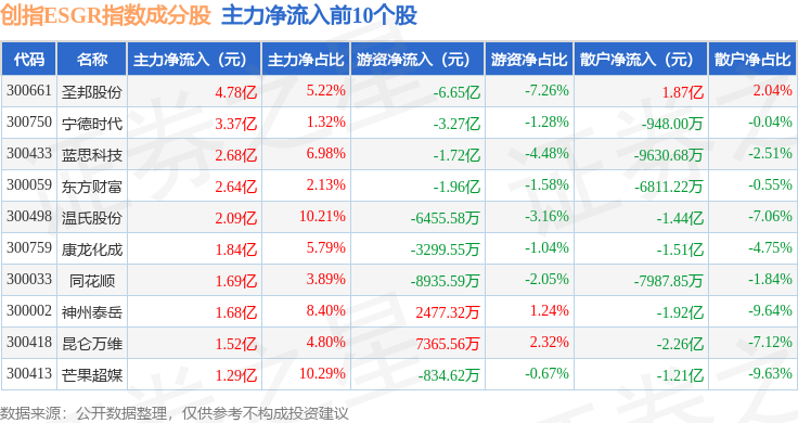 资金流向方面,创指ESGR(470028)指数成份股当日主力资金净流出合计36.29亿元,游资资金净流入合计14.83亿元,散户资金净流入合计21.46亿元。成份股资金流向详情见下表: