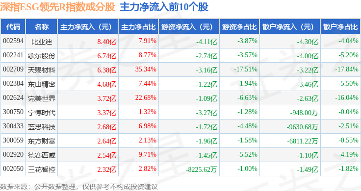 资金流向方面,深指ESG领先R(470029)指数成份股当日主力资金净流出合计56.46亿元,游资资金净流入合计13.91亿元,散户资金净流入合计42.55亿元。成份股资金流向详情见下表: