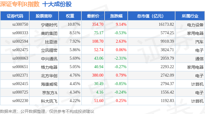 深证专利R(470067)指数十大成份股详情如下: