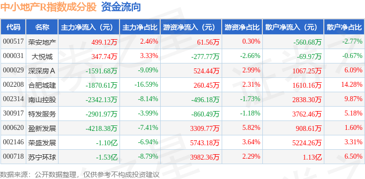 资金流向方面,中小地产R(471002)指数成份股当日主力资金净流出合计3.83亿元,游资资金净流入合计1.22亿元,散户资金净流入合计2.61亿元。成份股资金流向详情见下表: