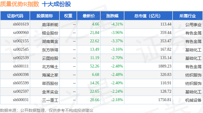 资金流向方面,质量优势R(489017)指数成份股当日主力资金净流出合计61.78亿元,游资资金净流入合计22.98亿元,散户资金净流入合计38.8亿元。成份股资金流向详情见下表:
