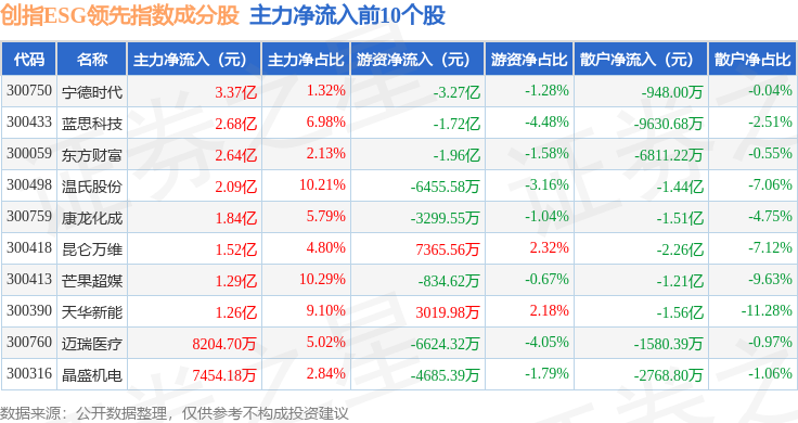 资金流向方面,创指ESG领先(970031)指数成份股当日主力资金净流出合计26.32亿元,游资资金净流入合计13.65亿元,散户资金净流入合计12.67亿元。成份股资金流向详情见下表: