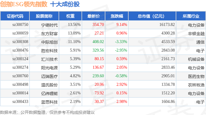 证券之星消息,9月15日,创指ESG领先(970031)指数报收于3400.96点,涨1.19%,成交1659.74亿元,换手率3.17%。当日该指数成份股中,上涨的有28家,宁德时代以9.14%的涨幅领涨,下跌的有22家,中际旭创以3.33%的跌幅领跌。