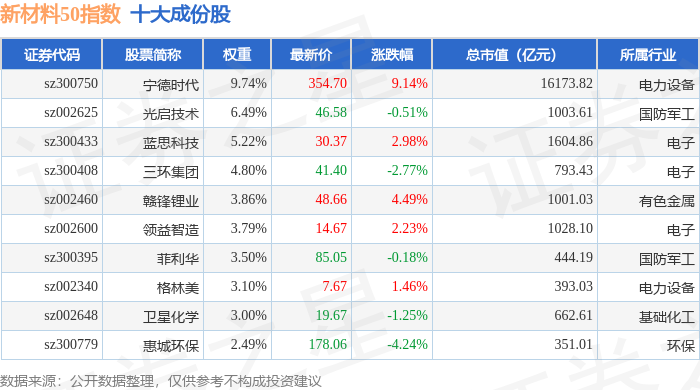 证券之星消息,9月15日,新材料50(970042)指数报收于3343.11点,涨1.55%,成交899.71亿元,换手率3.77%。当日该指数成份股中,上涨的有23家,尚太科技以10.0%的涨幅领涨,下跌的有27家,江海股份以4.35%的跌幅领跌。