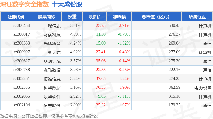 证券之星消息,9月15日,深证数字安全(970052)指数报收于3778.76点,跌0.38%,成交450.73亿元,换手率5.52%。当日该指数成份股中,上涨的有13家,东土科技以4.74%的涨幅领涨,下跌的有37家,东华软件以6.11%的跌幅领跌。