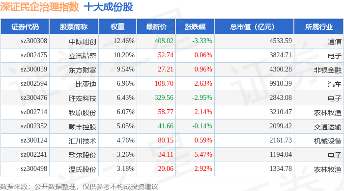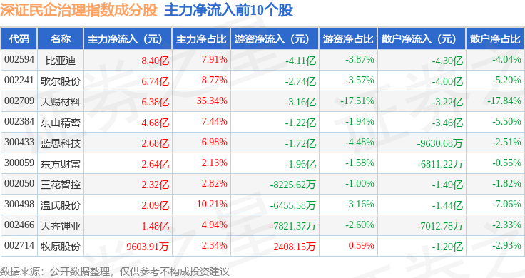 资金流向方面,深证民企治理(970058)指数成份股当日主力资金净流出合计4.26亿元,游资资金净流入合计2.53亿元,散户资金净流入合计1.72亿元。成份股资金流向详情见下表: