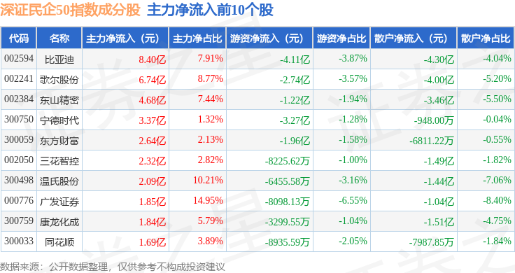 资金流向方面,深证民企50(970057)指数成份股当日主力资金净流出合计29.24亿元,游资资金净流入合计7.4亿元,散户资金净流入合计21.84亿元。成份股资金流向详情见下表: