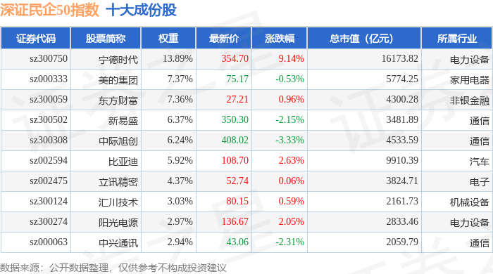 证券之星消息,9月15日,深证民企50(970057)指数报收于3257.51点,涨1.42%,成交2144.27亿元,换手率3.2%。当日该指数成份股中,上涨的有26家,宁德时代以9.14%的涨幅领涨,下跌的有24家,沪电股份以4.12%的跌幅领跌。