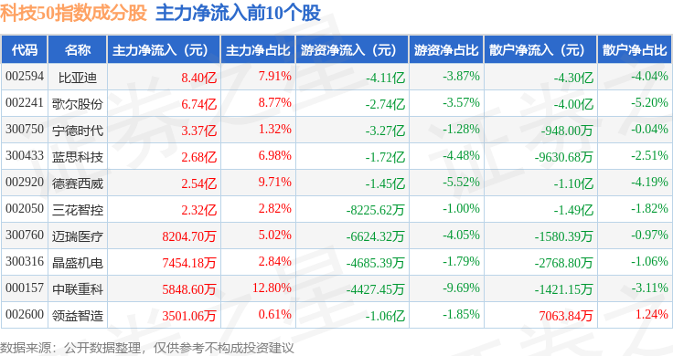资金流向方面,科技50(970080)指数成份股当日主力资金净流出合计30.92亿元,游资资金净流出合计8.14亿元,散户资金净流入合计39.07亿元。成份股资金流向详情见下表: