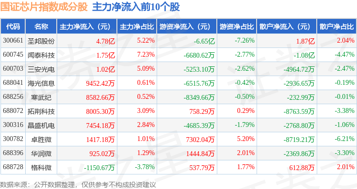 资金流向方面,国证芯片(980017)指数成份股当日主力资金净流出合计22.89亿元,游资资金净流入合计8.94亿元,散户资金净流入合计13.95亿元。成份股资金流向详情见下表: