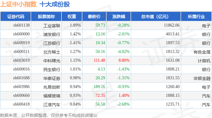 证券之星消息,9月16日,上证中小(000046)指数报收于5037.55点,涨0.14%,成交4101.4亿元,换手率1.46%。当日该指数成份股中,上涨的有220家,龙芯中科以14.89%的涨幅领涨,下跌的有221家,广晟有色以4.68%的跌幅领跌。