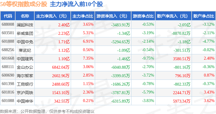资金流向方面,50等权(000050)指数成份股当日主力资金净流出合计118.83亿元,游资资金净流入合计49.58亿元,散户资金净流入合计69.24亿元。成份股资金流向详情见下表: