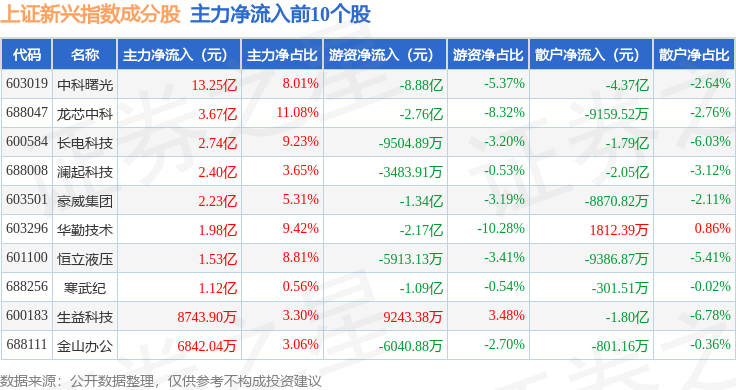 资金流向方面,上证新兴(000067)指数成份股当日主力资金净流出合计51.83亿元,游资资金净流入合计4.59亿元,散户资金净流入合计47.24亿元。成份股资金流向详情见下表: