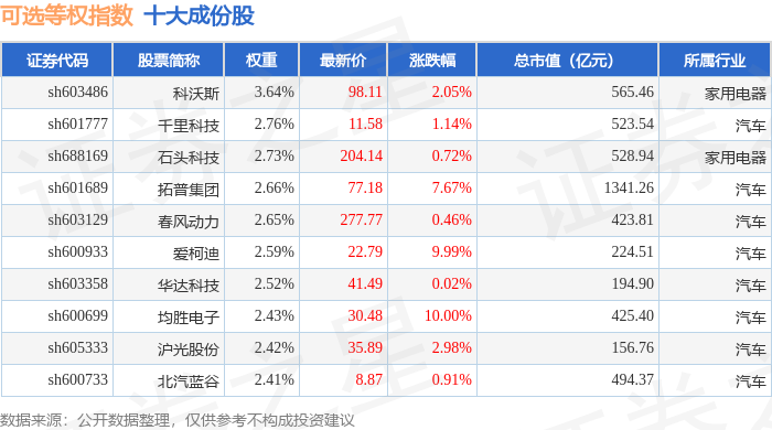 证券之星消息,9月16日,可选等权(000073)指数报收于3588.49点,涨2.07%,成交436.07亿元,换手率1.7%。当日该指数成份股中,上涨的有32家,新泉股份以10.0%的涨幅领涨,下跌的有18家,老凤祥以3.5%的跌幅领跌。