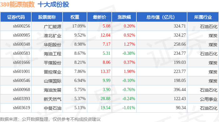 证券之星消息,9月16日,380能源(000104)指数报收于1275.87点,涨0.33%,成交31.51亿元,换手率0.98%。当日该指数成份股中,上涨的有8家,晋控煤业以1.98%的涨幅领涨,下跌的有6家,中曼石油以1.01%的跌幅领跌。