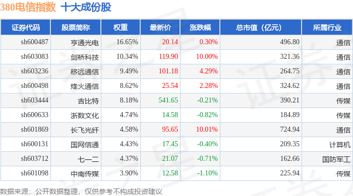 证券之星消息,9月16日,380电信(000112)指数报收于5998.22点,涨2.11%,成交171.73亿元,换手率2.3%。当日该指数成份股中,上涨的有12家,长飞光纤以10.01%的涨幅领涨,下跌的有9家,东方通信以2.1%的跌幅领跌。