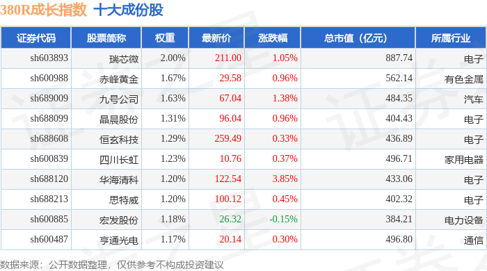 证券之星消息,9月16日,380R成长(000119)指数报收于4299.15点,涨1.02%,成交1709.75亿元,换手率2.11%。当日该指数成份股中,上涨的有154家,长飞光纤以10.01%的涨幅领涨,下跌的有124家,杭可科技以6.53%的跌幅领跌。