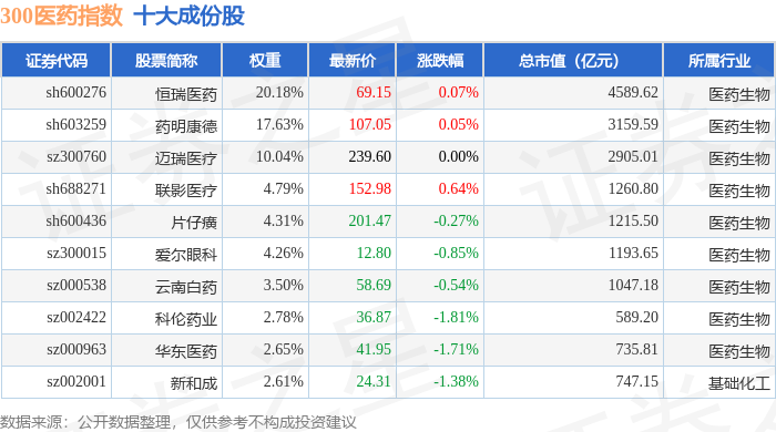 证券之星消息,9月16日,300医药(000913)指数报收于9595.53点,跌0.22%,成交217.45亿元,换手率0.97%。当日该指数成份股中,上涨的有10家,百利天恒以1.0%的涨幅领涨,下跌的有14家,长春高新以2.33%的跌幅领跌。