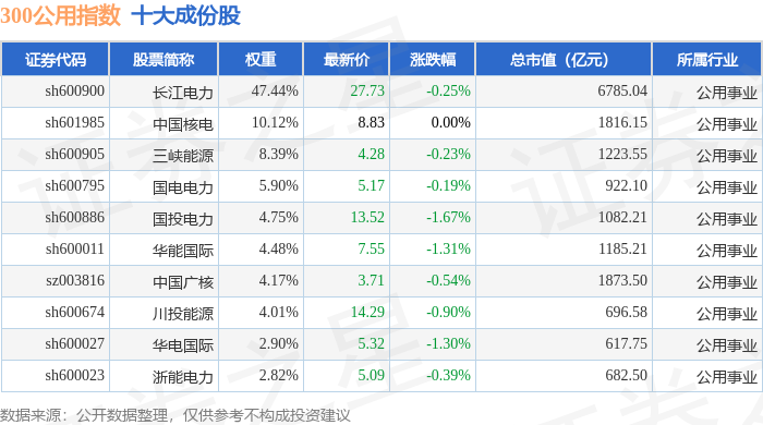 证券之星消息,9月16日,300公用(000917)指数报收于2514.23点,跌0.42%,成交67.68亿元,换手率0.41%。当日该指数成份股中,下跌的有12家,龙源电力以1.85%的跌幅领跌。