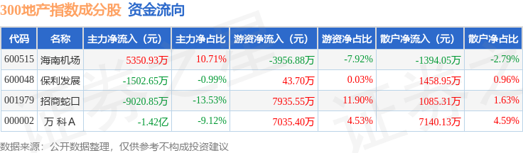 资金流向方面,300地产(000952)指数成份股当日主力资金净流出合计1.93亿元,游资资金净流入合计1.11亿元,散户资金净流入合计8290.33万元。成份股资金流向详情见下表: