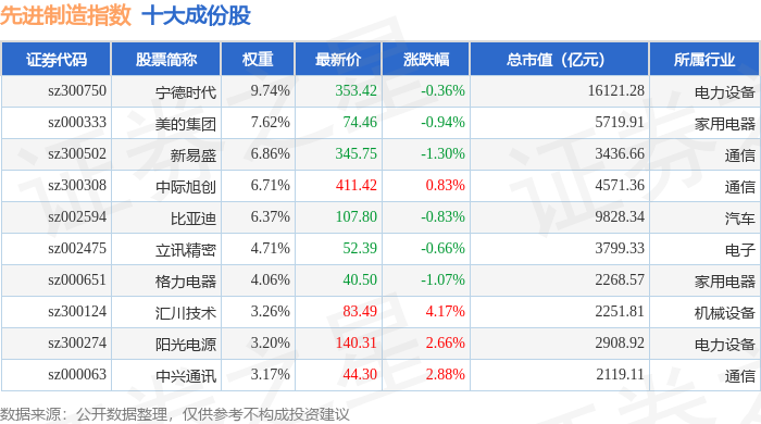 证券之星消息,9月16日,先进制造(399260)指数报收于3541.8点,涨0.18%,成交1864.45亿元,换手率1.91%。当日该指数成份股中,上涨的有19家,三花智控以10.01%的涨幅领涨,下跌的有30家,圣邦股份以4.74%的跌幅领跌。