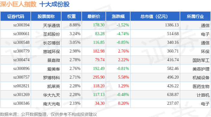 证券之星消息,9月16日,深小巨人(399268)指数报收于2014.7点,涨1.01%,成交729.64亿元,换手率4.65%。当日该指数成份股中,上涨的有72家,斯菱股份以12.02%的涨幅领涨,下跌的有28家,圣邦股份以4.74%的跌幅领跌。