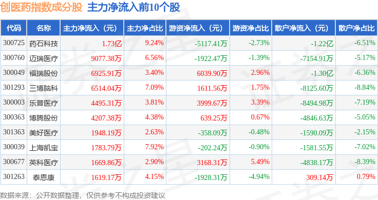 资金流向方面,创医药(399275)指数成份股当日主力资金净流出合计6.97亿元,游资资金净流入合计4.23亿元,散户资金净流入合计2.74亿元。成份股资金流向详情见下表: