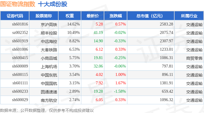 证券之星消息,9月16日,国证物流(399353)指数报收于2168.65点,涨0.13%,成交179.03亿元,换手率0.8%。当日该指数成份股中,上涨的有20家,辽港股份以3.95%的涨幅领涨,下跌的有19家,深圳华强以2.25%的跌幅领跌。
